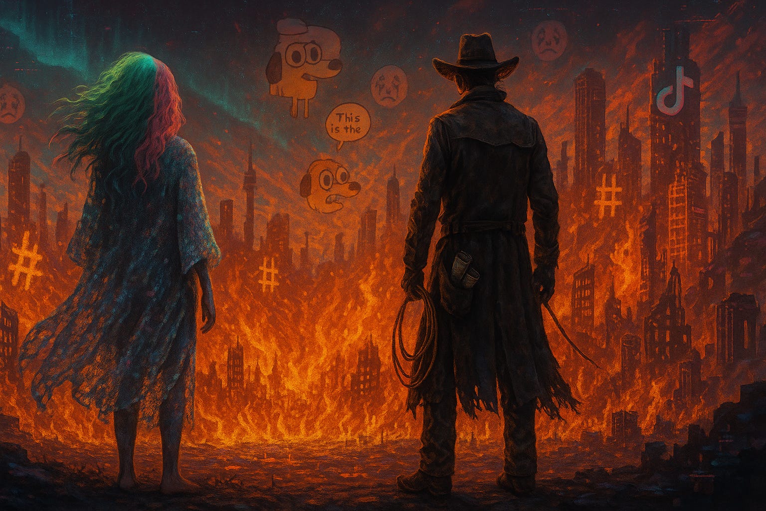 This meme draws from overlapping ontological wells: cultural disillusionment, digital immersion, mythic collapse, and psychological overload. It's a symbolic husk with mythic DNA—recycling hell not as fire, but as bureaucracy, burnout, and glitch.