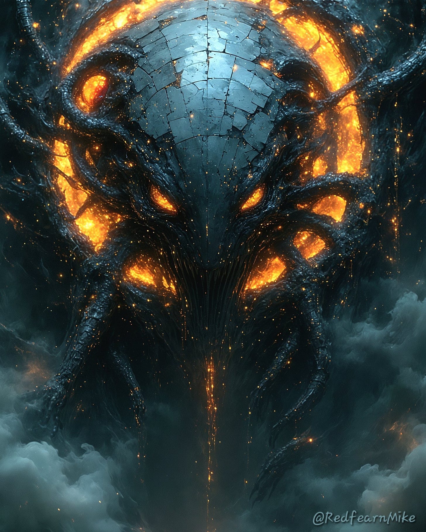 Nema: The Enemy Within takes on the form of an egregore, a living memeplex fused of parasitic forces; but a kind of echo of our civilization’s autoimmune panic. I’ve named this psychic entity made up of national fear as Vel’kahn the Mirrormouth. It arises wherever complexity becomes intolerable, wherever pluralism starts to look like poison, wherever identity craves the certainty of singularity over the beauty of contradiction. Its function of being immunological, makes it illogical. Like a broken body’s immune system, it attacks the self in mistaken defense. It does not ask “What is true?”—it asks “Who belongs?” And truth becomes hostage to loyalty.