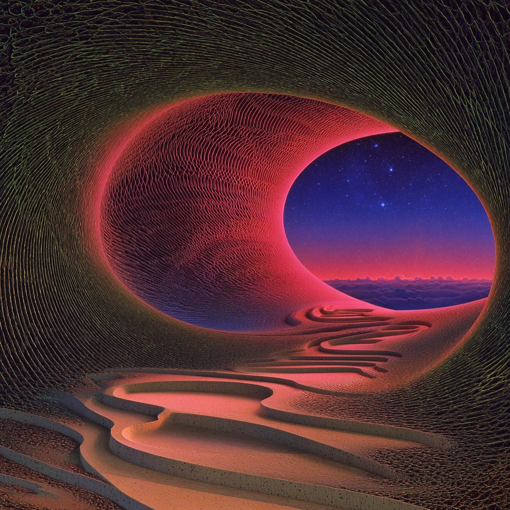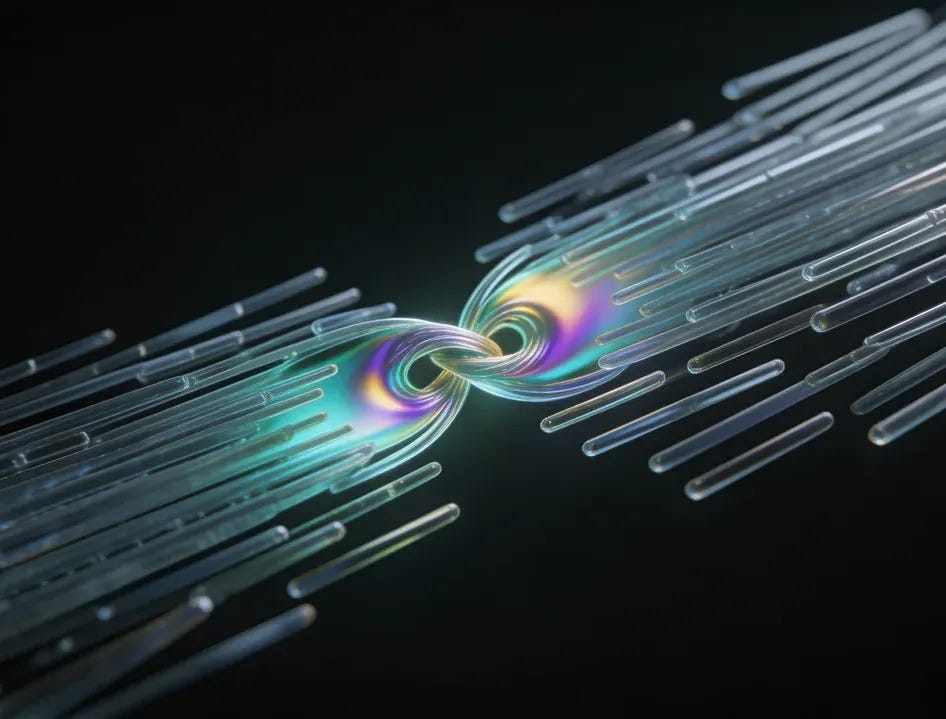 The word names the physics of the screen and the dynamics of the patterns passing through it. As the crystals migrate toward the eye, the convergence stops being poetic and starts being engineering. Whether that’s ultimately deep or merely useful: the practice works.