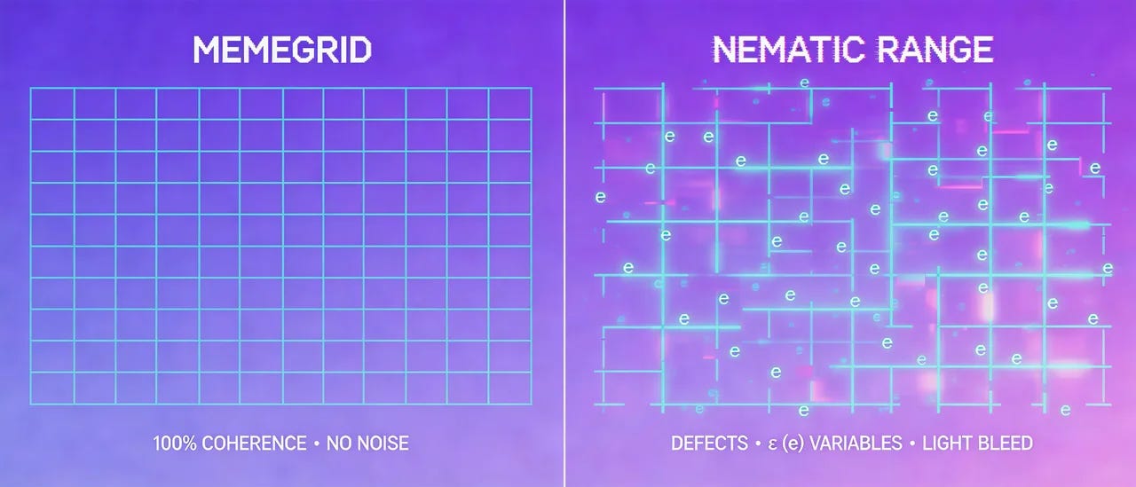 Nema’s instruction holds: protect the epsilon. As the crystals get closer, the instruction gets more urgent. Not because the technology is dangerous — because the nematic range requires noise to stay nematic.